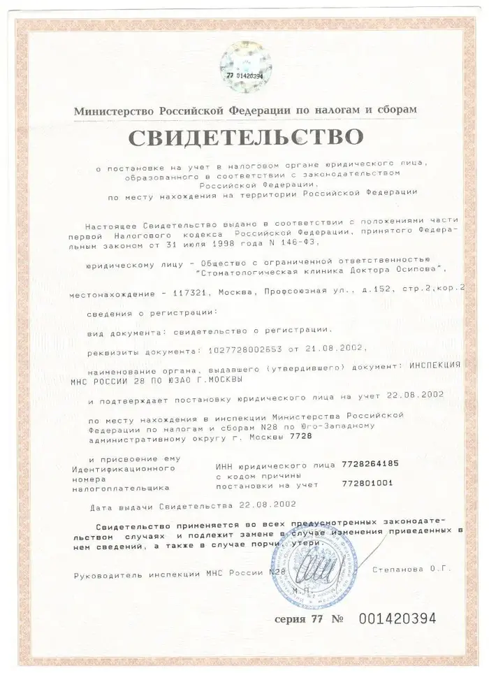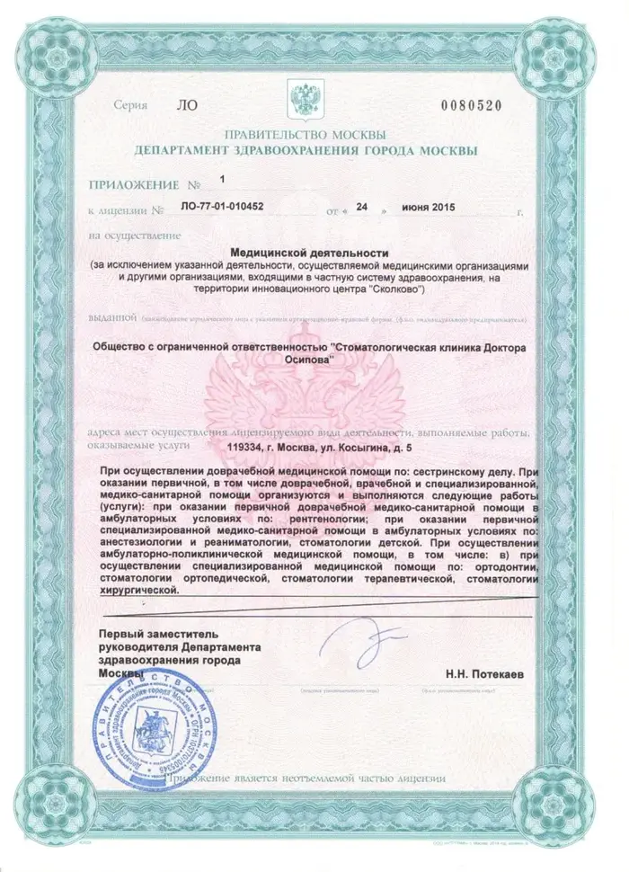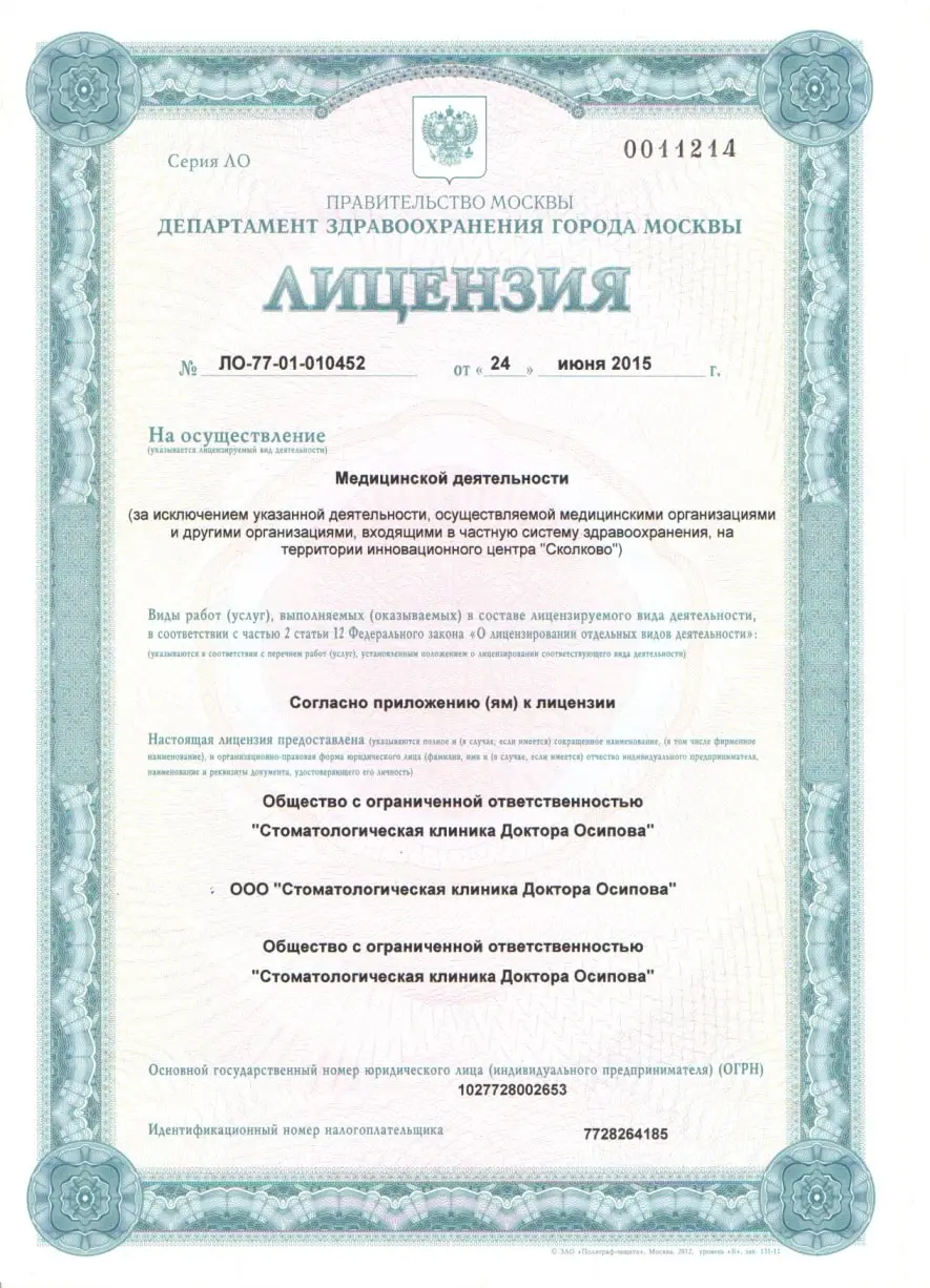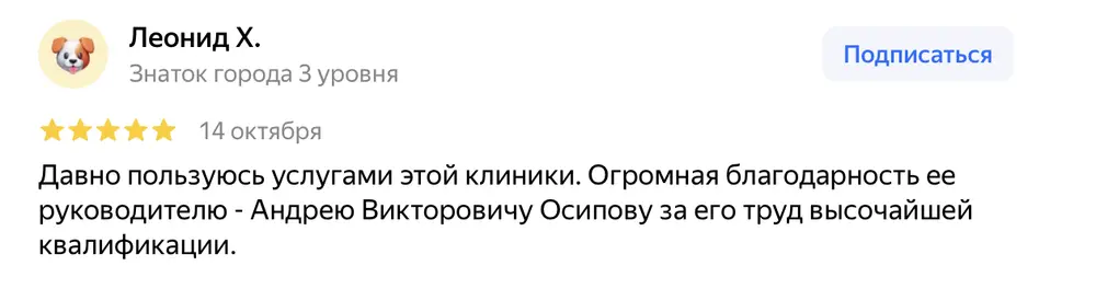 Давно пользуюсь услугами этой клиники. Огромная благодарность ее руководителю - Андрею Викторовичу Осипову за его труд высочайшей квалификации.