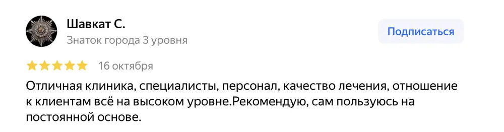 Это моё не первое посещение клиники, пользуюсь этой клиникой на протяжении нескольких лет. Понравилось: Профессиональный подход сотрудников к своей работе. Буду продолжать пользоваться вашей клиникой и буду рекомендовать вас своим знакомым.