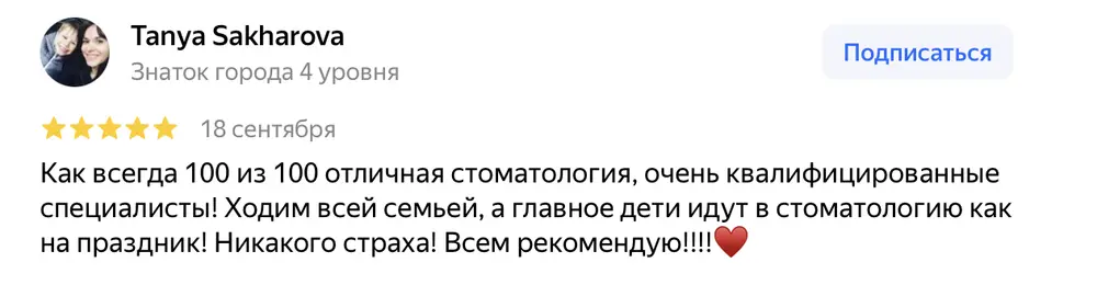 Как всегда 100 из 100 отличная стоматология, очень квалифицированные специалисты! Ходим всей семьей, а главное дети идут в стоматологию как на праздник! Никакого страха! Всем рекомендую!!!!♥️