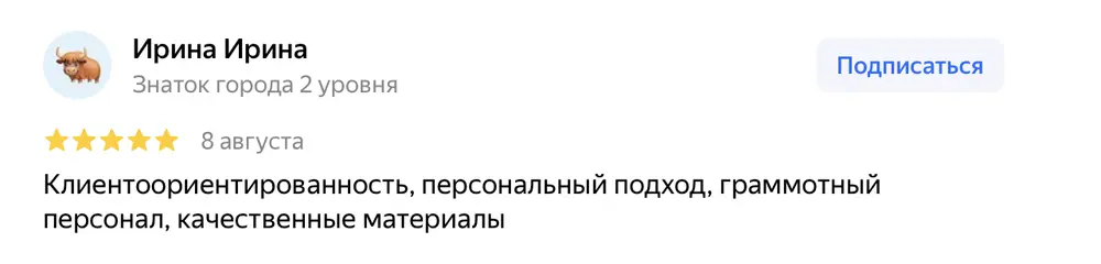 Клиентоориентированность, персональный подход, граммотный персонал, качественные материалы.