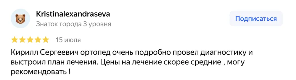 Кирилл Сергеевич ортопед очень подробно провел диагностику и выстроил план лечения. Цены на лечение скорее средние , могу рекомендовать !