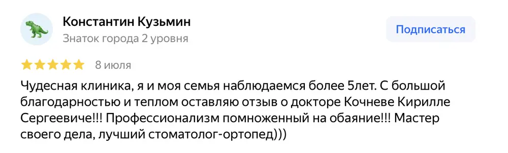Чудесная клиника, я и моя семья наблюдаемся более 5лет. С большой благодарностью и теплом оставляю отзыв о докторе Кочневе Кирилле Сергеевиче!!! Профессионализм помноженный на обаяние!!! Мастер своего дела, лучший стоматолог-ортопед)))