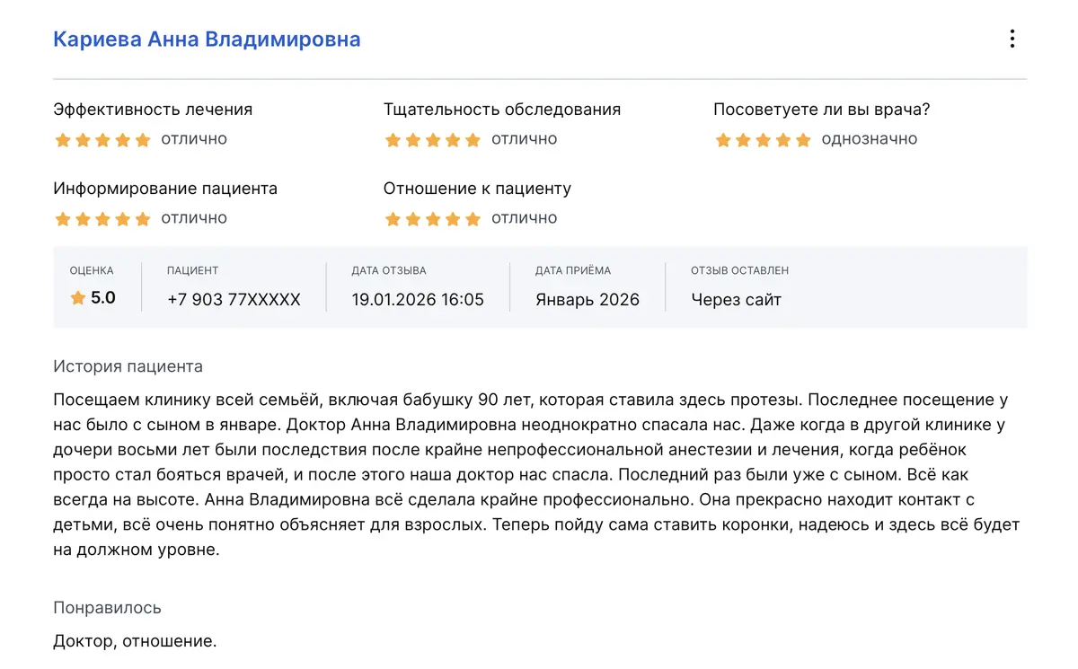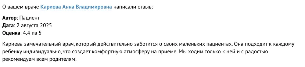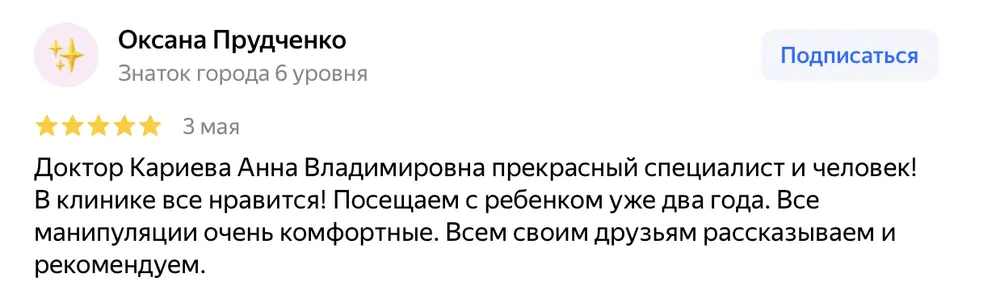 Доктор Кариева Анна Владимировна прекрасный специалист и человек! В клинике все нравится! Посещаем с ребенком уже два года. Все манипуляции очень комфортные. Всем своим друзьям рассказываем и рекомендуем.