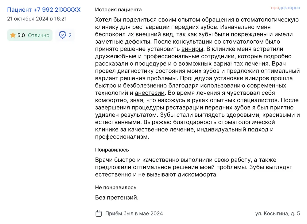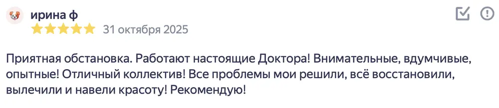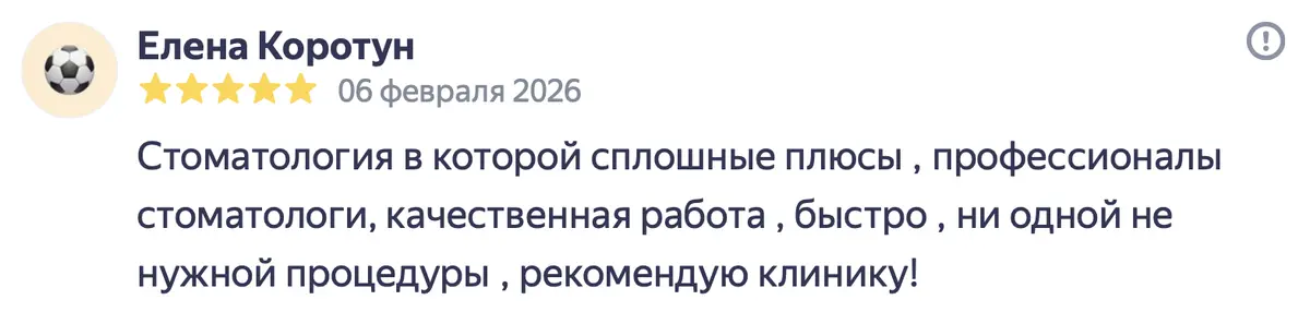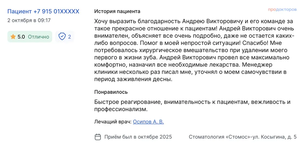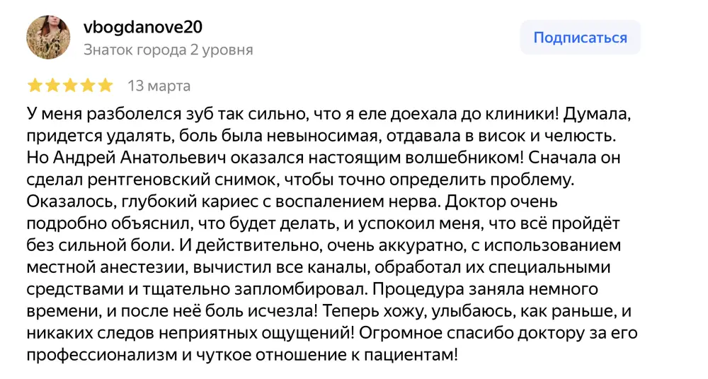 Хочу выразить благодарность Андрею Викторовичу и его команде за такое прекрасное отношение к пациентам! Андрей Викторович очень внимателен, объясняет все очень подробно, даже не остается каких-либо вопросов. Помог в моей непростой ситуации! Спасибо! Мне потребовалось хирургическое вмешательство при удалении моего первого в жизни зуба. Андрей Викторович провел все максимально комфортно, назначил все необходимые лекарства. Менеджер клиники несколько раз писал мне, уточнял о моем самочувствии в период заживления десны. Быстрое реагирование, внимательность к пациентам, вежливость и профессионализм.