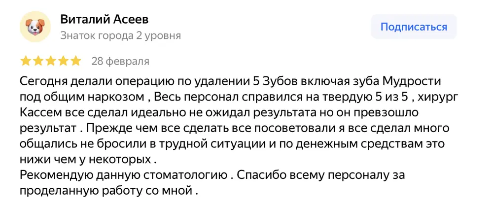 Сегодня делали операцию по удалении 5 Зубов включая зуба Мудрости под общим наркозом , Весь персонал справился на твердую 5 из 5 , хирург Кассем все сделал идеально не ожидал результата но он превзошло результат . Прежде чем все сделать все посоветовали я все сделал много общались не бросили в трудной ситуации и по денежным средствам это нижи чем у некоторых . Рекомендую данную стоматологию . Спасибо всему персоналу за проделанную работу со мной .