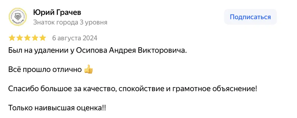 Был на удалении у Осипова Андрея Викторовича. Всё прошло отлично! Спасибо большое за качество, спокойствие и грамотное объяснение! Только наивысшая оценка!!