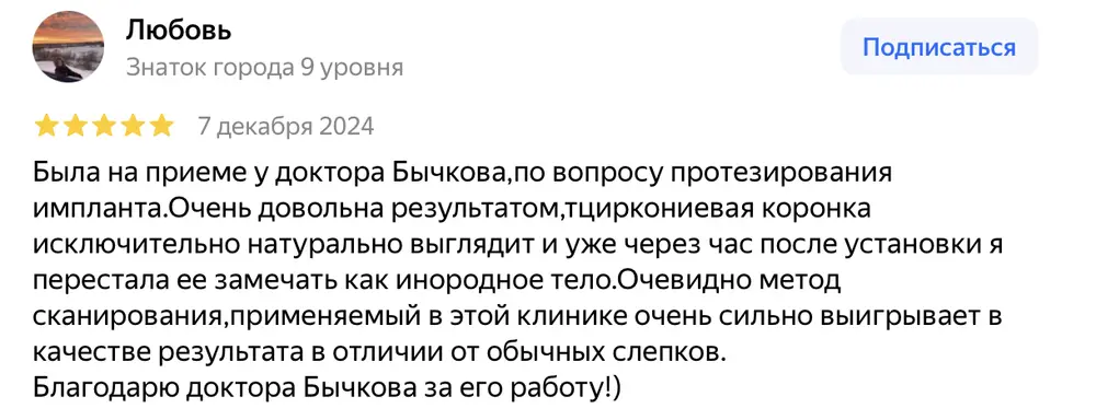 Была на приеме у доктора Бычкова,по вопросу протезирования импланта.Очень довольна результатом,тциркониевая коронка исключительно натурально выглядит и уже через час после установки я перестала ее замечать как инородное тело.Очевидно метод сканирования,применяемый в этой клинике очень сильно выигрывает в качестве результата в отличии от обычных слепков. Благодарю доктора Бычкова за его работу!)