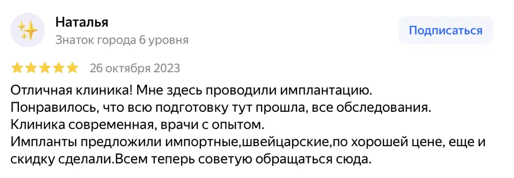 Отличная клиника! Мне здесь проводили имплантацию. Понравилось, что всю подготовку тут прошла, все обследования. Клиника современная, врачи с опытом. Импланты предложили импортные,швейцарские,по хорошей цене, еще и скидку сделали.Всем теперь советую обращаться сюда.