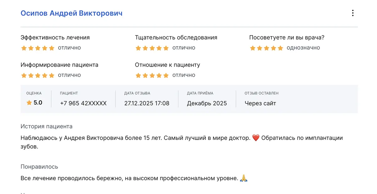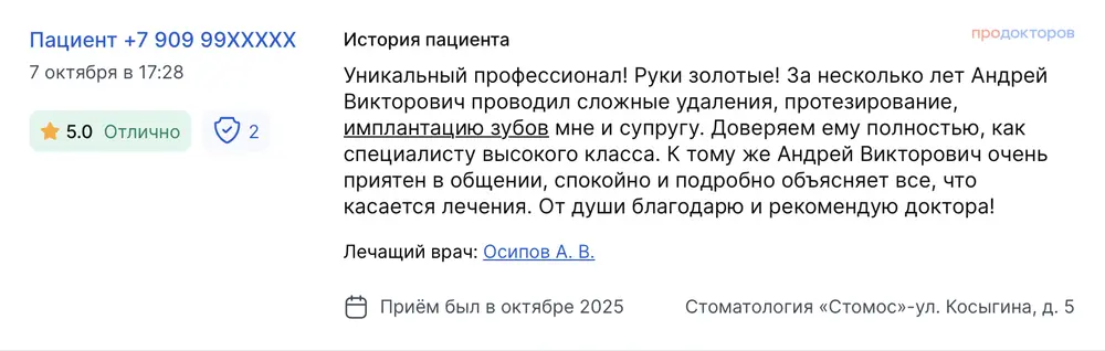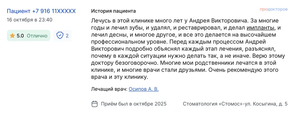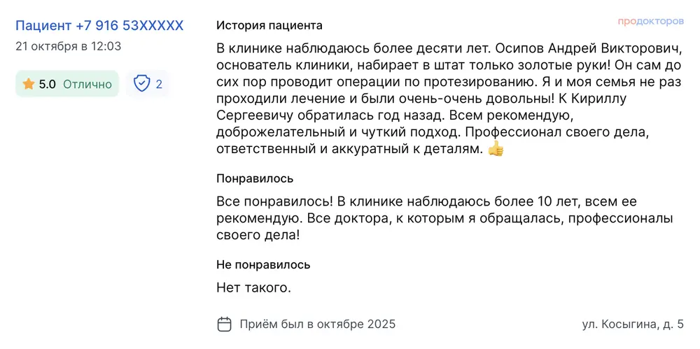 В клинике наблюдаюсь более десяти лет. Осипов Андрей Викторович, основатель клиники, набирает в штат только золотые руки! Он сам до сих пор проводит операции по протезированию. Я и моя семья не раз проходили лечение и были очень-очень довольны! К Кириллу Сергеевичу обратилась год назад. Всем рекомендую, доброжелательный и чуткий подход. Профессионал своего дела, ответственный и аккуратный к деталям. Все понравилось! В клинике наблюдаюсь более 10 лет, всем ее рекомендую. Все доктора, к которым я обращалась, профессионалы своего дела!