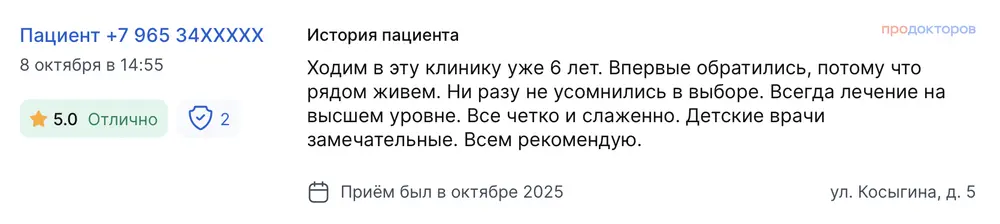 Ходим в эту клинику уже 6 лет. Впервые обратились, потому что рядом живем. Ни разу не усомнились в выборе. Всегда лечение на высшем уровне. Все четко и слаженно. Детские врачи замечательные. Всем рекомендую.
