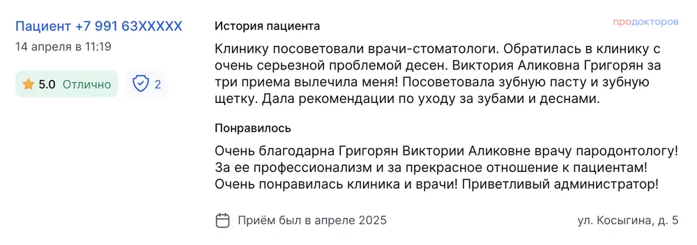 Клинику посоветовали врачи-стоматологи. Обратилась в клинику с очень серьезной проблемой десен. Виктория Аликовна Григорян за три приема вылечила меня! Посоветовала зубную пасту и зубную щетку. Дала рекомендации по уходу за зубами и деснами. Очень благодарна Григорян Виктории Аликовне врачу пародонтологу! За ее профессионализм и за прекрасное отношение к пациентам! Очень понравилась клиника и врачи! Приветливый администратор!