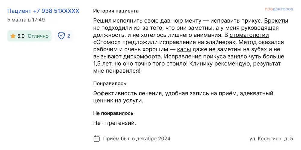 Решил исполнить свою давнюю мечту — исправить прикус. Брекеты не подходили из-за того, что они заметны, а у меня руководящая должность, и не хотелось лишнего внимания. В стоматологии «Стомос» предложили исправление на элайнерах. Метод оказался рабочим и очень хорошим — капы даже не заметны на зубах и не вызывают дискомфорта. Исправление прикуса заняло чуть больше 1,5 лет, но оно точно того стоило! Клинику рекомендую, результат мне понравился! Эффективность лечения, удобная запись на приём, адекватный ценник на услуги.
