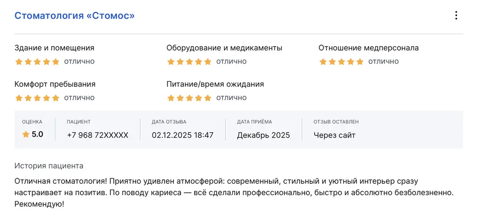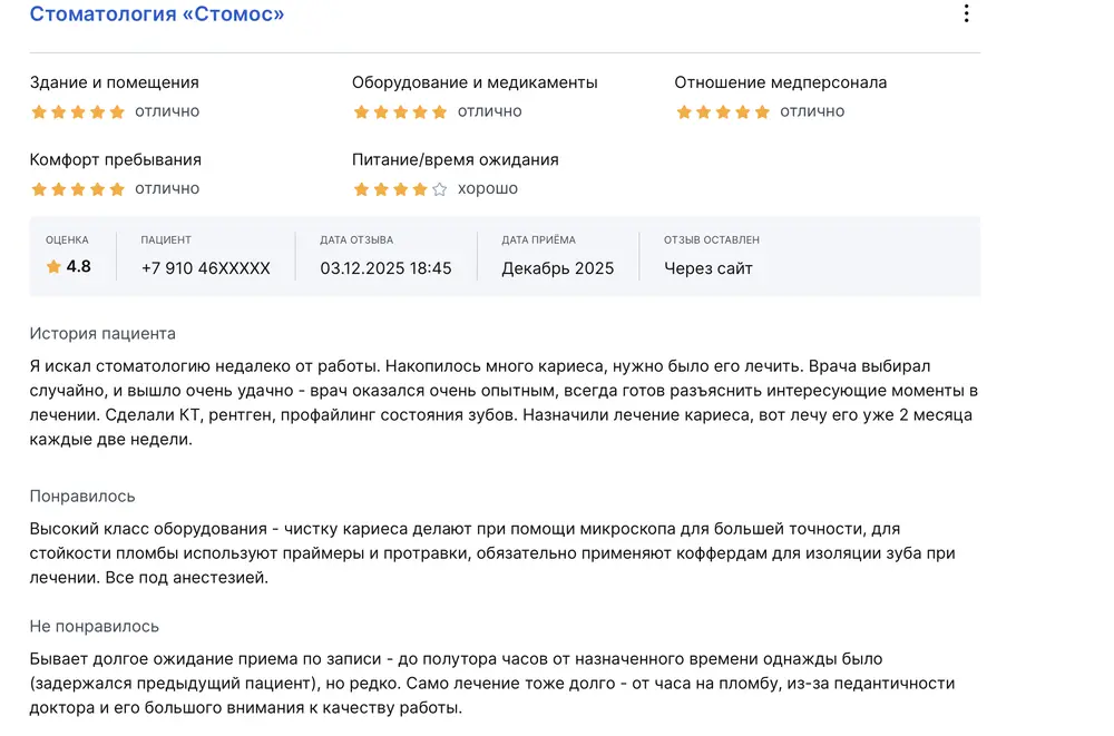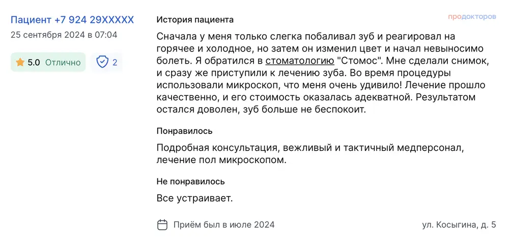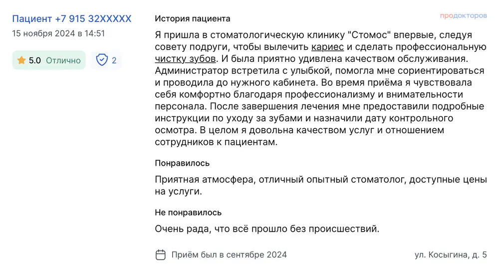 Я пришла в стоматологическую клинику "Стомос" впервые, следуя совету подруги, чтобы вылечить кариес и сделать профессиональную чистку зубов. И была приятно удивлена качеством обслуживания. Администратор встретила с улыбкой, помогла мне сориентироваться и проводила до нужного кабинета. Во время приёма я чувствовала себя комфортно благодаря профессионализму и внимательности персонала. После завершения лечения мне предоставили подробные инструкции по уходу за зубами и назначили дату контрольного осмотра. В целом я довольна качеством услуг и отношением сотрудников к пациентам. Приятная атмосфера, отличный опытный стоматолог, доступные цены на услуги. Очень рада, что всё прошло без происшествий.