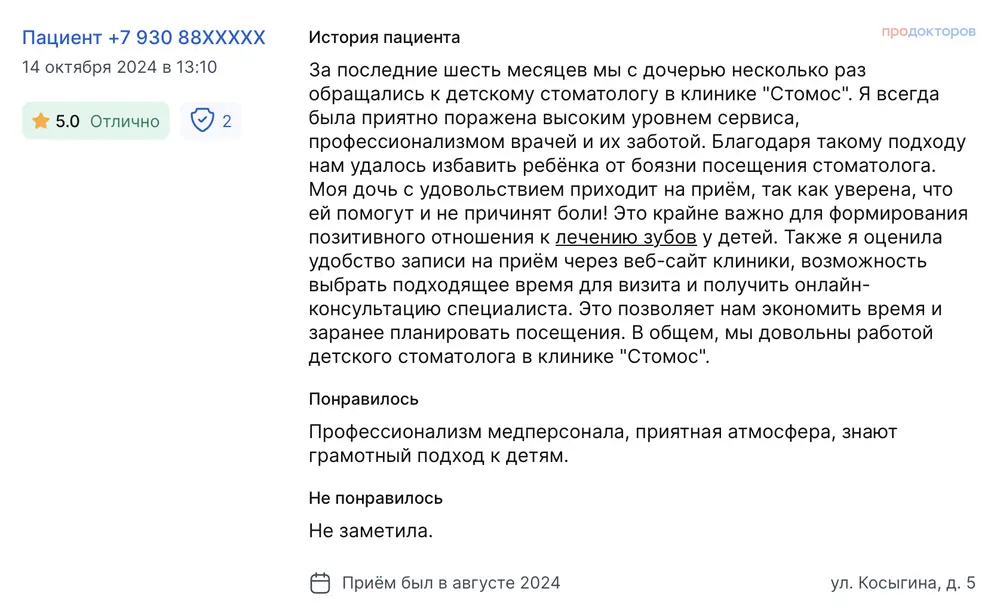 За последние шесть месяцев мы с дочерью несколько раз обращались к детскому стоматологу в клинике "Стомос". Я всегда была приятно поражена высоким уровнем сервиса, профессионализмом врачей и их заботой. Благодаря такому подходу нам удалось избавить ребёнка от боязни посещения стоматолога. Моя дочь с удовольствием приходит на приём, так как уверена, что ей помогут и не причинят боли! Это крайне важно для формирования позитивного отношения к лечению зубов у детей. Также я оценила удобство записи на приём через веб-сайт клиники, возможность выбрать подходящее время для визита и получить онлайн-консультацию специалиста. Это позволяет нам экономить время и заранее планировать посещения. В общем, мы довольны работой детского стоматолога в клинике "Стомос". Понравилось Профессионализм медперсонала, приятная атмосфера, знают грамотный подход к детям.