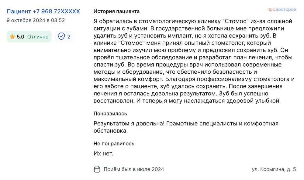 Я обратилась в стоматологическую клинику "Стомос" из-за сложной ситуации с зубами. В государственной больнице мне предложили удалить зуб и установить имплант, но я хотела сохранить зуб. В клинике "Стомос" меня принял опытный стоматолог, который внимательно изучил мою проблему и предложил сохранить зуб. Он провёл тщательное обследование и разработал план лечения, чтобы спасти зуб. Во время процедуры врач использовал современные методы и оборудование, что обеспечило безопасность и максимальный комфорт. Благодаря профессионализму стоматолога и его заботе о пациенте, зуб удалось сохранить. После завершения лечения я осталась довольна результатом. Зуб был успешно восстановлен. И теперь я могу наслаждаться здоровой улыбкой. Результатом я довольна! Грамотные специалисты и комфортная обстановка.