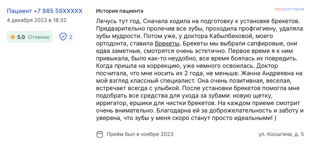 Лечусь тут год. Сначала ходила на подготовку к установке брекетов. Предварительно пролечив все зубы, проходила профгигиену, удаляла зубы мудрости. Потом уже, у доктора Кабылбековой, моего ортодонта, ставила брекеты. Брекеты мы выбрали сапфировые, они едва заметные, смотрятся очень эстетично. Первое время я к ним привыкала, было как-то неудобно, все время боялась их повредить. Когда пришла на коррекцию, уже немного освоилась. Доктор посчитала, что мне носить их 2 года, не меньше. Жанна Андреевна на мой взгляд классный специалист. Она очень позитивная, веселая, встречает всегда с улыбкой. После установки брекетов помогла мне подобрать все средства для ухода за зубами: новую щетку, ирригатор, ершики для чистки брекетов. На каждом приеме смотрит очень внимательно. Благодарна ей за доброжелательность и заботу и уверена, что зубы у меня скоро станут просто идеальными! )