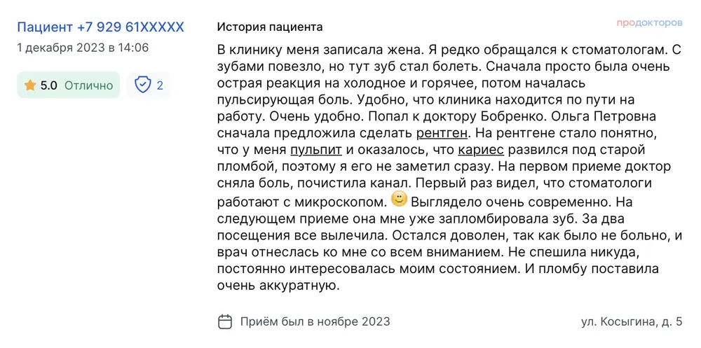 В клинику меня записала жена. Я редко обращался к стоматологам. С зубами повезло, но тут зуб стал болеть. Сначала просто была очень острая реакция на холодное и горячее, потом началась пульсирующая боль. Удобно, что клиника находится по пути на работу. Очень удобно. Попал к доктору Бобренко. Ольга Петровна сначала предложила сделать рентген. На рентгене стало понятно, что у меня пульпит и оказалось, что кариес развился под старой пломбой, поэтому я его не заметил сразу. На первом приеме доктор сняла боль, почистила канал. Первый раз видел, что стоматологи работают с микроскопом. :) Выглядело очень современно. На следующем приеме она мне уже запломбировала зуб. За два посещения все вылечила. Остался доволен, так как было не больно, и врач отнеслась ко мне со всем вниманием. Не спешила никуда, постоянно интересовалась моим состоянием. И пломбу поставила очень аккуратную.