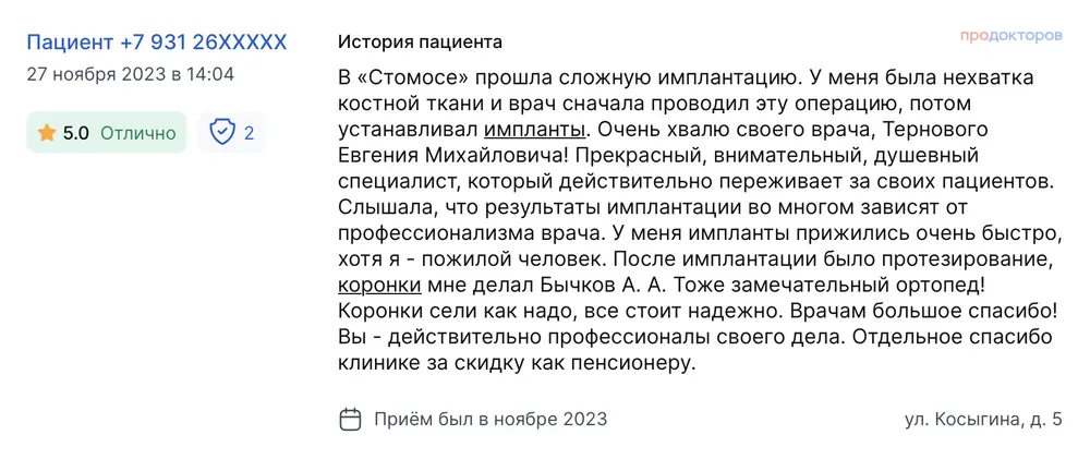 В «Стомосе» прошла сложную имплантацию. У меня была нехватка костной ткани и врач сначала проводил эту операцию, потом устанавливал импланты. Очень хвалю своего врача, Тернового Евгения Михайловича! Прекрасный, внимательный, душевный специалист, который действительно переживает за своих пациентов. Слышала, что результаты имплантации во многом зависят от профессионализма врача. У меня импланты прижились очень быстро, хотя я - пожилой человек. После имплантации было протезирование, коронки мне делал Бычков А. А. Тоже замечательный ортопед! Коронки сели как надо, все стоит надежно. Врачам большое спасибо! Вы - действительно профессионалы своего дела. Отдельное спасибо клинике за скидку как пенсионеру.