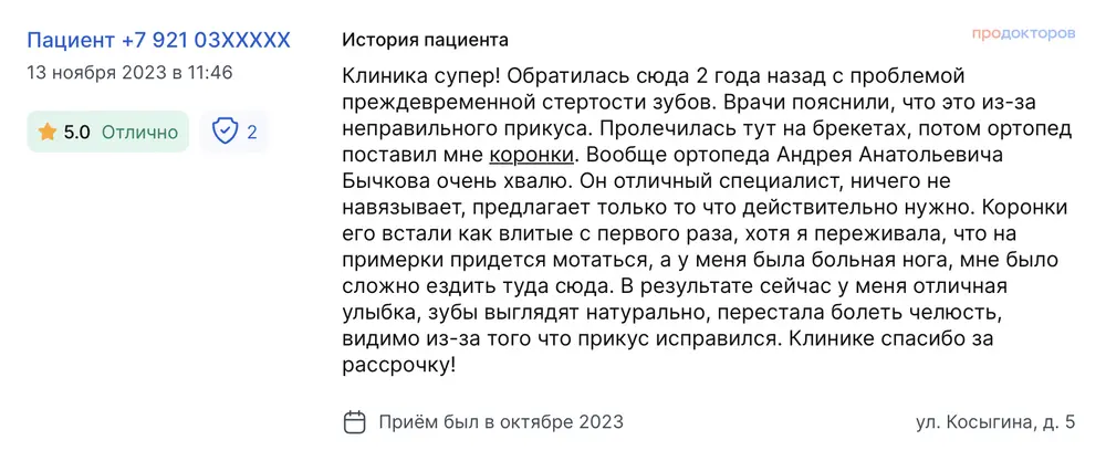 Клиника супер! Обратилась сюда 2 года назад с проблемой преждевременной стертости зубов. Врачи пояснили, что это из-за неправильного прикуса. Пролечилась тут на брекетах, потом ортопед поставил мне коронки. Вообще ортопеда Андрея Анатольевича Бычкова очень хвалю. Он отличный специалист, ничего не навязывает, предлагает только то что действительно нужно. Коронки его встали как влитые с первого раза, хотя я переживала, что на примерки придется мотаться, а у меня была больная нога, мне было сложно ездить туда сюда. В результате сейчас у меня отличная улыбка, зубы выглядят натурально, перестала болеть челюсть, видимо из-за того что прикус исправился. Клинике спасибо за рассрочку!