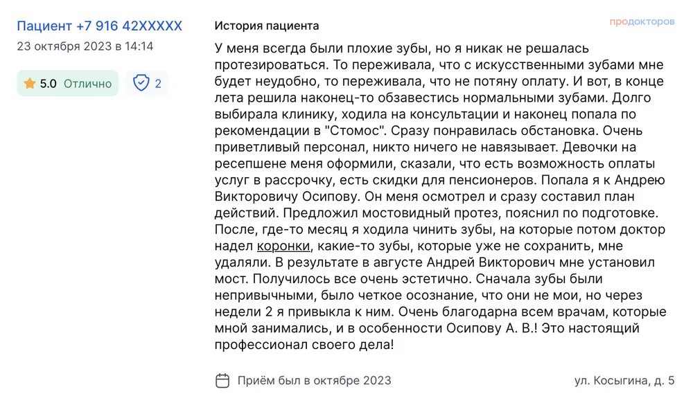 У меня всегда были плохие зубы, но я никак не решалась протезироваться. То переживала, что с искусственными зубами мне будет неудобно, то переживала, что не потяну оплату. И вот, в конце лета решила наконец-то обзавестись нормальными зубами. Долго выбирала клинику, ходила на консультации и наконец попала по рекомендации в "Стомос". Сразу понравилась обстановка. Очень приветливый персонал, никто ничего не навязывает. Девочки на ресепшене меня оформили, сказали, что есть возможность оплаты услуг в рассрочку, есть скидки для пенсионеров. Попала я к Андрею Викторовичу Осипову. Он меня осмотрел и сразу составил план действий. Предложил мостовидный протез, пояснил по подготовке. После, где-то месяц я ходила чинить зубы, на которые потом доктор надел коронки, какие-то зубы, которые уже не сохранить, мне удаляли. В результате в августе Андрей Викторович мне установил мост. Получилось все очень эстетично. Сначала зубы были непривычными, было четкое осознание, что они не мои, но через недели 2 я привыкла к ним. Очень благодарна всем врачам, которые мной занимались, и в особенности Осипову А. В.! Это настоящий профессионал своего дела!