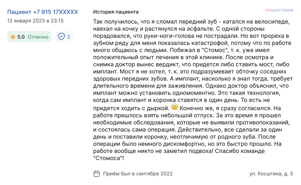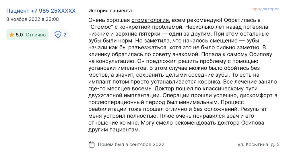 Очень хорошая стоматология, всем рекомендую! Обратилась в "Стомос" с конкретной проблемой. Несколько лет назад потеряла нижние и верхние пятерки — один за другим. При этом остальные зубы были норм. Но заметила, что началось смещение — зубы начали как бы разъезжаться, хотя это не было сильно заметно. В клинику обратилась по совету знакомой. Попала к самому Осипову на консультацию. Он предложил решить проблему с помощью установки имплантов. В этом случае можно было обойтись без мостов, а значит, сохранить целыми соседние зубы. То есть на имплант потом просто устанавливается коронка. Все лечение заняло где-то месяцев восемь. Доктор пошел по классическому пути двухэтапной имплантации. Операции прошли успешно, дискомфорт в послеоперационный период был минимальным. Процесс реабилитации тоже прошел отлично и без осложнений. Результат меня устроил полностью. Плюс очень понравился врач и его отношение ко мне. Могу смело рекомендовать доктора Осипова другим пациентам.