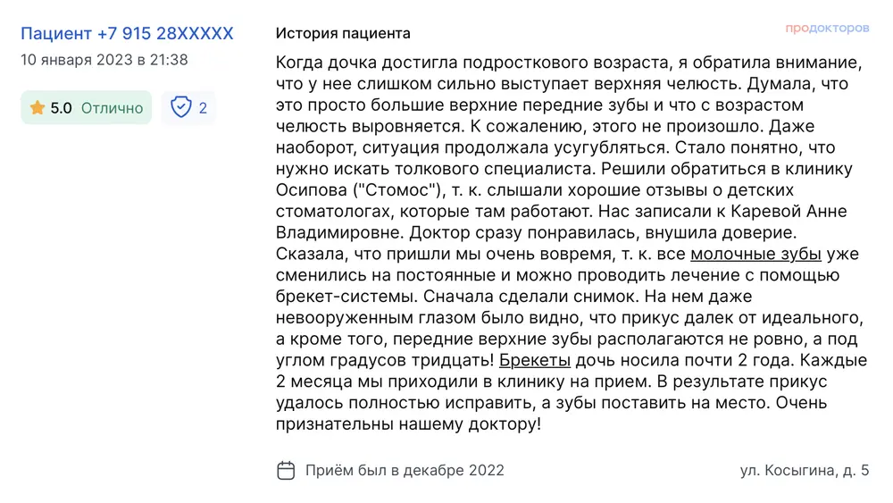 Когда дочка достигла подросткового возраста, я обратила внимание, что у нее слишком сильно выступает верхняя челюсть. Думала, что это просто большие верхние передние зубы и что с возрастом челюсть выровняется. К сожалению, этого не произошло. Даже наоборот, ситуация продолжала усугубляться. Стало понятно, что нужно искать толкового специалиста. Решили обратиться в клинику Осипова ("Стомос"), т. к. слышали хорошие отзывы о детских стоматологах, которые там работают. Нас записали к Каревой Анне Владимировне. Доктор сразу понравилась, внушила доверие. Сказала, что пришли мы очень вовремя, т. к. все молочные зубы уже сменились на постоянные и можно проводить лечение с помощью брекет-системы. Сначала сделали снимок. На нем даже невооруженным глазом было видно, что прикус далек от идеального, а кроме того, передние верхние зубы располагаются не ровно, а под углом градусов тридцать! Брекеты дочь носила почти 2 года. Каждые 2 месяца мы приходили в клинику на прием. В результате прикус удалось полностью исправить, а зубы поставить на место. Очень признательны нашему доктору!