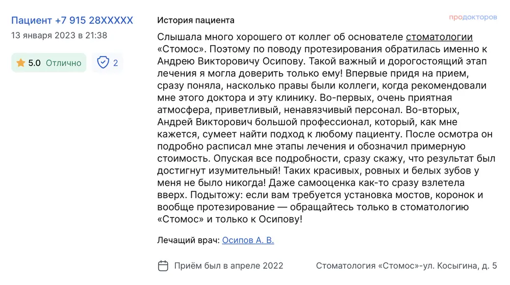 Слышала много хорошего от коллег об основателе стоматологии «Стомос». Поэтому по поводу протезирования обратилась именно к Андрею Викторовичу Осипову. Такой важный и дорогостоящий этап лечения я могла доверить только ему! Впервые придя на прием, сразу поняла, насколько правы были коллеги, когда рекомендовали мне этого доктора и эту клинику. Во-первых, очень приятная атмосфера, приветливый, ненавязчивый персонал. Во-вторых, Андрей Викторович большой профессионал, который, как мне кажется, сумеет найти подход к любому пациенту. После осмотра он подробно расписал мне этапы лечения и обозначил примерную стоимость. Опуская все подробности, сразу скажу, что результат был достигнут изумительный! Таких красивых, ровных и белых зубов у меня не было никогда! Даже самооценка как-то сразу взлетела вверх. Подытожу: если вам требуется установка мостов, коронок и вообще протезирование — обращайтесь только в стоматологию «Стомос» и только к Осипову!
