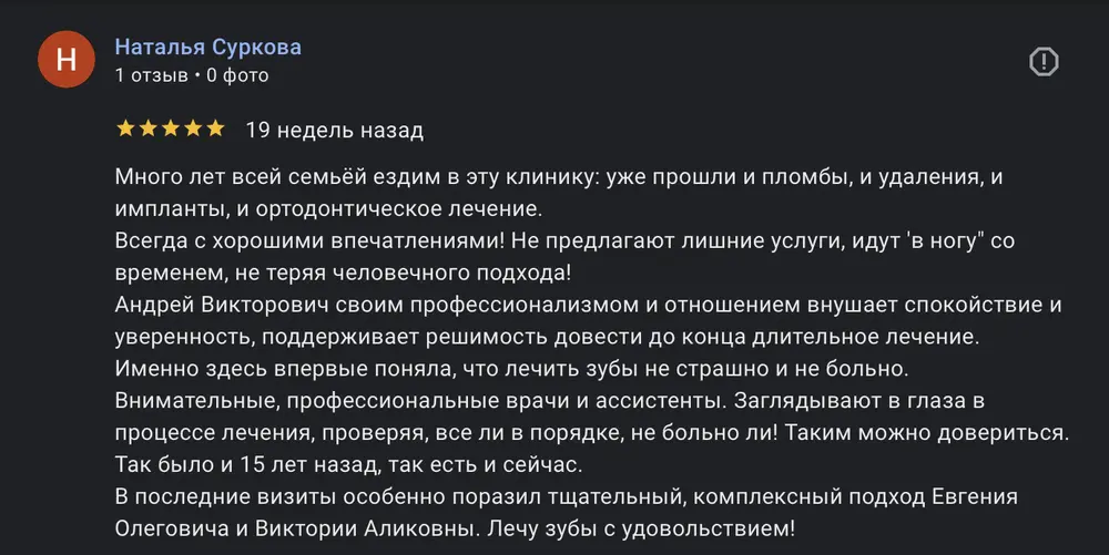 Много лет всей семьёй ездим в эту клинику: уже прошли и пломбы, и удаления, и импланты, и ортодонтическое лечение. Всегда с хорошими впечатлениями! Не предлагают лишние услуги, идут 'в ногу" со временем, не теряя человечного подхода! Андрей Викторович своим профессионализмом и отношением внушает спокойствие и уверенность, поддерживает решимость довести до конца длительное лечение. Именно здесь впервые поняла, что лечить зубы не страшно и не больно. Внимательные, профессиональные врачи и ассистенты. Заглядывают в глаза в процессе лечения, проверяя, все ли в порядке, не больно ли! Таким можно довериться. Так было и 15 лет назад, так есть и сейчас. В последние визиты особенно поразил тщательный, комплексный подход Евгения Олеговича и Виктории Аликовны. Лечу зубы с удовольствием!