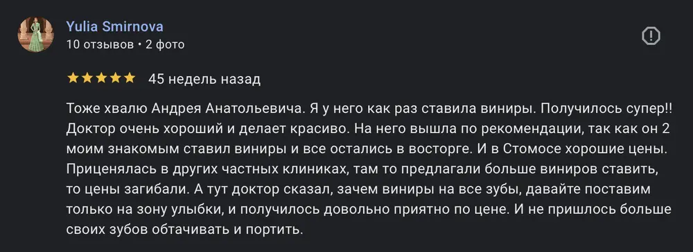 Тоже хвалю Андрея Анатольевича. Я у него как раз ставила виниры. Получилось супер!! Доктор очень хороший и делает красиво. На него вышла по рекомендации, так как он 2 моим знакомым ставил виниры и все остались в восторге. И в Стомосе хорошие цены. Приценялась в других частных клиниках, там то предлагали больше виниров ставить, то цены загибали. А тут доктор сказал, зачем виниры на все зубы, давайте поставим только на зону улыбки, и получилось довольно приятно по цене. И не пришлось больше своих зубов обтачивать и портить.