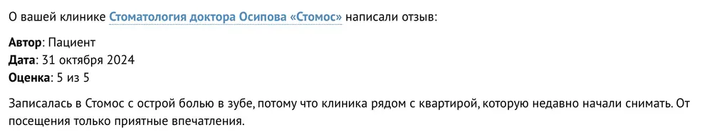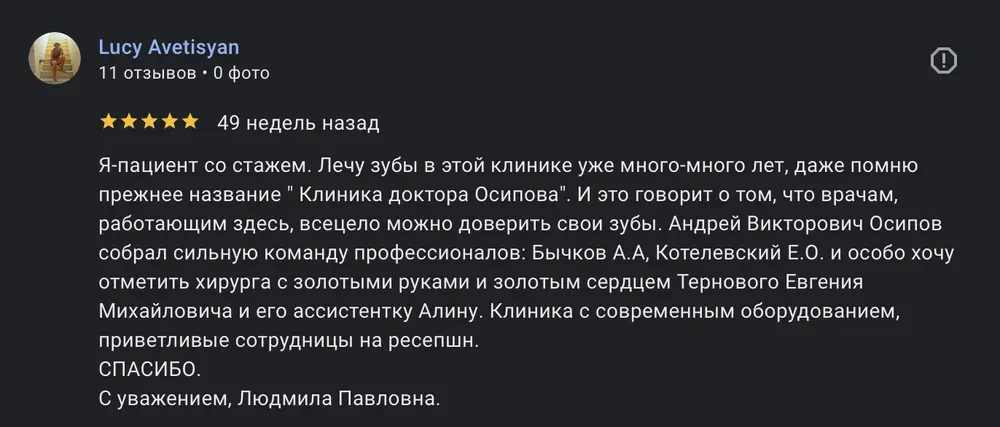Я-пациент со стажем. Лечу зубы в этой клинике уже много-много лет, даже помню прежнее название " Клиника доктора Осипова". И это говорит о том, что врачам, работающим здесь, всецело можно доверить свои зубы. Андрей Викторович Осипов собрал сильную команду профессионалов: Бычков А.А, Котелевский E.О. и особо хочу отметить хирурга с золотыми руками и золотым сердцем Тернового Евгения Михайловича и его ассистентку Алину. Клиника с современным оборудованием, приветливые сотрудницы на ресепшн. СПАСИБО. С уважением, Людмила Павловна.