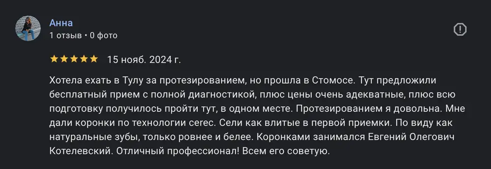 Хотела ехать в Тулу за протезированием, но прошла в Стомосе. Тут предложили бесплатный прием с полной диагностикой, плюс цены очень адекватные, плюс всю подготовку получилось пройти тут, в одном месте. Протезированием я довольна. Мне дали коронки по технологии cerec. Сели как влитые в первой приемки. По виду как натуральные зубы, только ровнее и белее. Коронками занимался Евгений Олегович Котелевский. Отличный профессионал! Всем его советую.