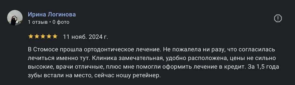 В Стомосе прошла ортодонтическое лечение. Не пожалела ни разу, что согласилась лечиться именно тут. Клиника замечательная, удобно расположена, цены не сильно высокие, врачи отличные, плюс мне помогли оформить лечение в кредит. За 1,5 года зубы встали на место, сейчас ношу ретейнер.