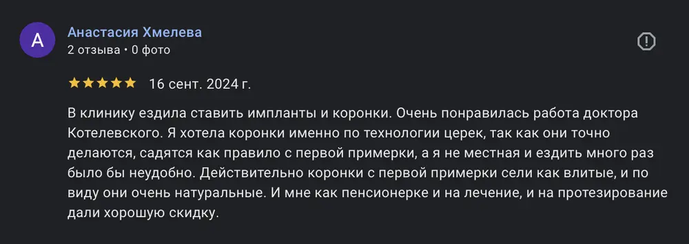 В клинику ездила ставить импланты и коронки. Очень понравилась работа доктора Котелевского. Я хотела коронки именно по технологии церек, так как они точно делаются, садятся как правило с первой примерки, а я не местная и ездить много раз было бы неудобно. Действительно коронки с первой примерки сели как влитые, и по виду они очень натуральные. И мне как пенсионерке и на лечение, и на протезирование дали хорошую скидку.