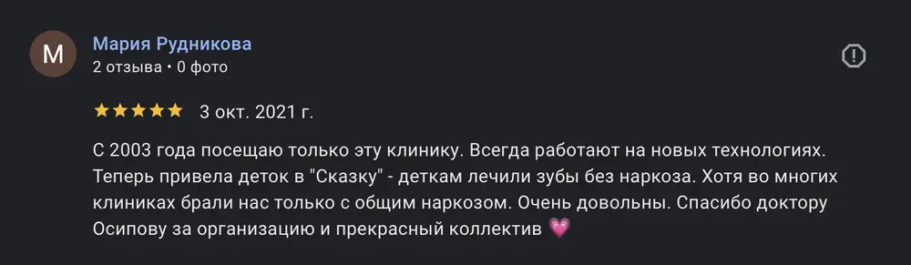 С 2003 года посещаю только эту клинику. Всегда работают на новых технологиях. Теперь привела деток в "Сказку" - деткам лечили зубы без наркоза. Хотя во многих клиниках брали нас только с общим наркозом. Очень довольны. Спасибо доктору Осипову за организацию и прекрасный коллектив!