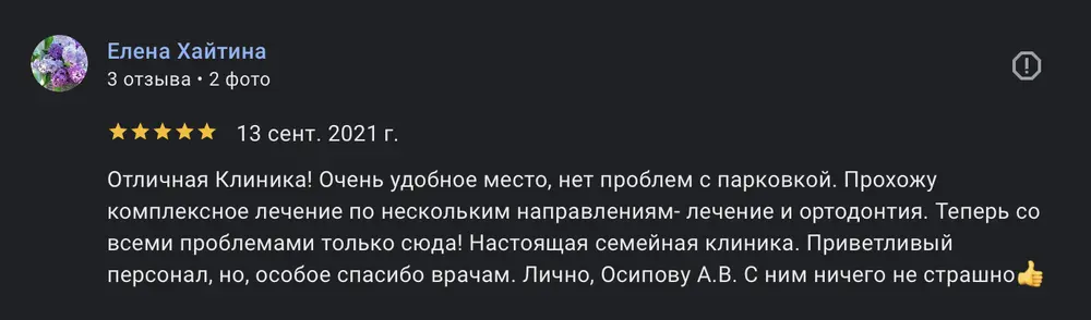 Отличная Клиника! Очень удобное место, нет проблем с парковкой. Прохожу комплексное лечение по нескольким направлениям- лечение и ортодонтия. Теперь со всеми проблемами только сюда! Настоящая семейная клиника. Приветливый персонал, но, особое спасибо врачам. Лично, Осипову А.В. С ним ничего не страшно!