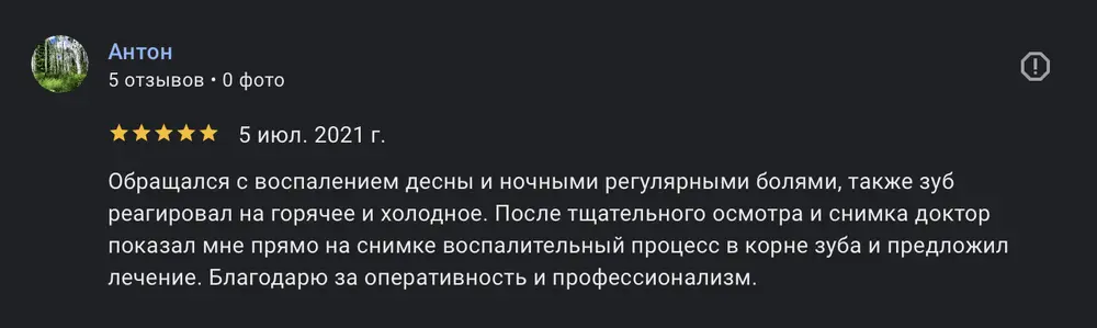 Обращался с воспалением десны и ночными регулярными болями, также зуб реагировал на горячее и холодное. После тщательного осмотра и снимка доктор показал мне прямо на снимке воспалительный процесс в корне зуба и предложил лечение. Благодарю за оперативность и профессионализм.