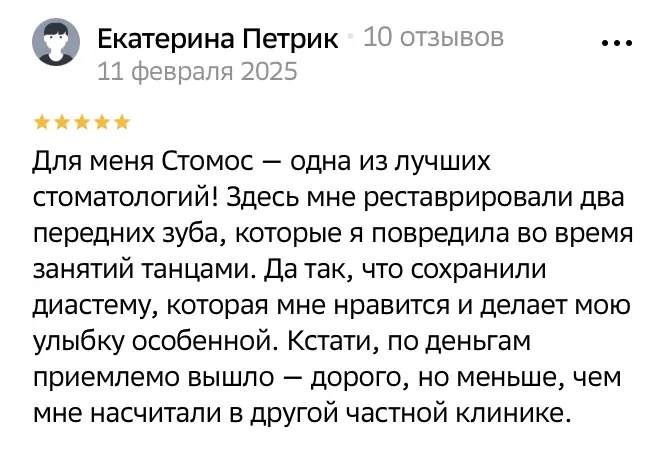 Для меня Стомос — одна из лучших стоматологий! Здесь мне реставрировали два передних зуба, которые я повредила во время занятий танцами. Да так, что сохранили диастему, которая мне нравится и делает мою улыбку особенной. Кстати, по деньгам приемлемо вышло — дорого, но меньше, чем мне насчитали в другой частной клинике.