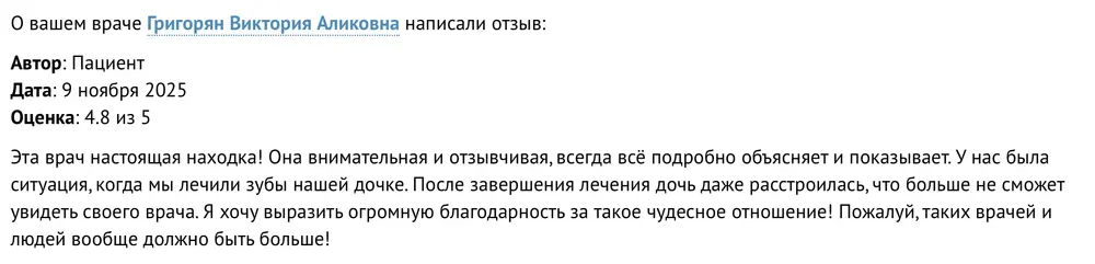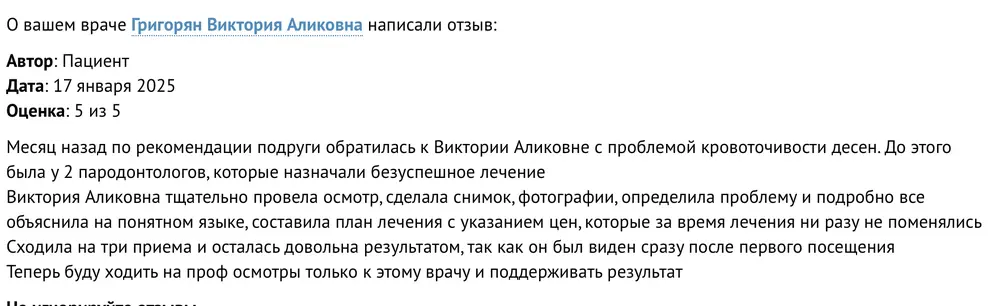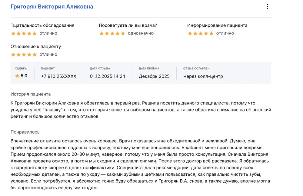 К Григорян Виктории Аликовне я обратилась в первый раз. Решила посетить данного специалиста, потому что увидела у неё "плашку" о том, что этот врач является выбором пациентов, а также обратила внимание на её высокий рейтинг и большое количество отзывов. Впечатление от визита осталось очень хорошее. Врач показалась мне обходительной и вежливой. Думаю, она крайне профессионально подошла к вопросу, поэтому мне всё понравилось. В кабинет меня пригласили вовремя. Приём продолжался около 20-30 минут, наверное, потому что у меня была просто консультация. Сначала Виктория Аликовна провела осмотр, а потом мы сходили и сделали снимки. После этого доктор всё рассказала. Я обратилась к пародонтологу скорее в целях профилактики. Специалист дала рекомендации, дала советы по поводу всех необходимых деталей, а также по уходу - какими зубными щётками пользоваться, как правильно чистить зубы, условно. Если потребуется, я абсолютно точно буду обращаться к Григорян В.А. снова, а также думаю, вполне могла бы порекомендовать её другим.