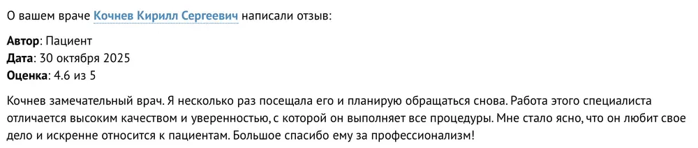 Кочнев замечательный врач. Я несколько раз посещала его и планирую обращаться снова. Работа этого специалиста отличается высоким качеством и уверенностью, с которой он выполняет все процедуры. Мне стало ясно, что он любит свое дело и искренне относится к пациентам. Большое спасибо ему за профессионализм!