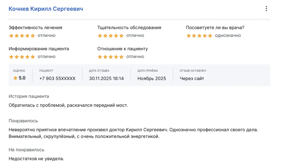Обратилась с проблемой, раскачался передний мост. Невероятно приятное впечатление произвел доктор Кирилл Сергеевич. Однозначно профессионал своего дела. Внимательный, скрупулёзный, с очень положительной энергетикой.