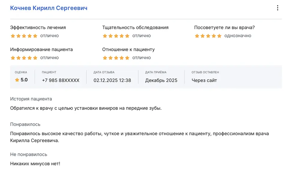 Обратился к врачу с целью установки виниров на передние зубы. Понравилось высокое качество работы, чуткое и уважительное отношение к пациенту, профессионализм врача Кирилла Сергеевича.