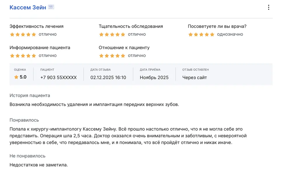 Возникла необходимость удаления и имплантация передних верхних зубов. Попала к хирургу-имплантологу Кассему Зейну. Всё прошло настолько отлично, что я не могла себе это представить. Операция шла 2,5 часа. Доктор оказался очень внимательным и заботливым, с невероятной уверенностью в себе, что передавалось мне, и я понимала, что всё пройдёт отлично и никак иначе.
