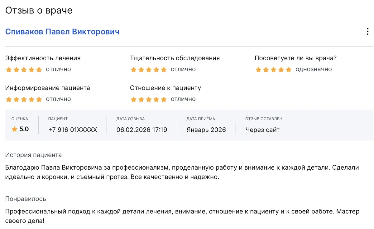 Благодарю Павла Викторовича за профессионализм, проделанную работу и внимание к каждой детали. Сделали идеально и коронки, и съемный протез. Все качественно и надежно. Профессиональный подход к каждой детали лечения, внимание, отношение к пациенту и к своей работе. Мастер своего дела!