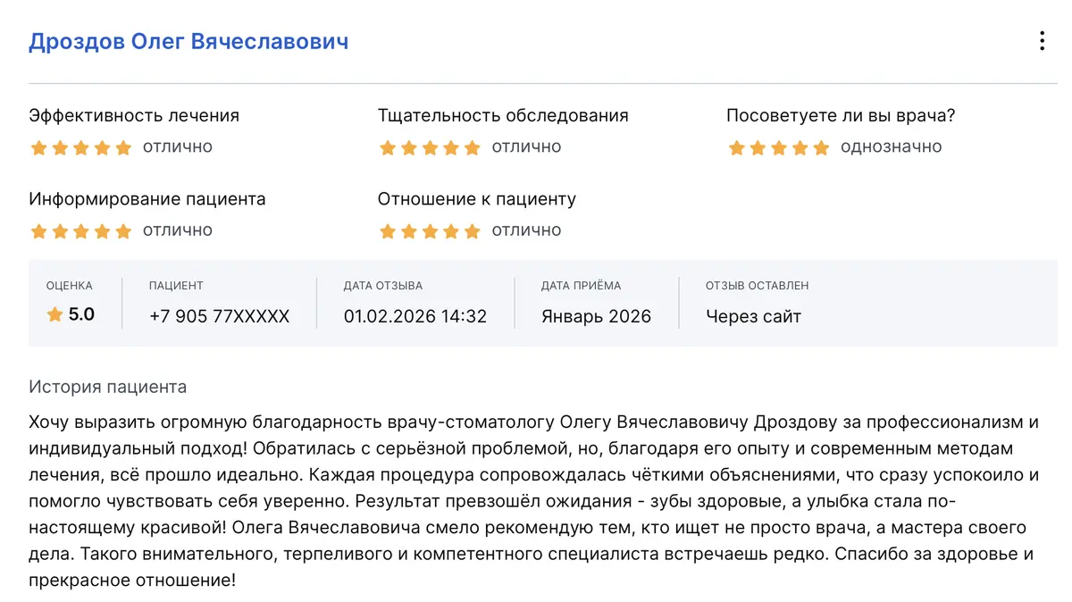 Хочу выразить огромную благодарность врачу-стоматологу Олегу Вячеславовичу Дроздову за профессионализм и индивидуальный подход! Обратилась с серьёзной проблемой, но, благодаря его опыту и современным методам лечения, всё прошло идеально. Каждая процедура сопровождалась чёткими объяснениями, что сразу успокоило и помогло чувствовать себя уверенно. Результат превзошёл ожидания - зубы здоровые, а улыбка стала по-настоящему красивой! Олега Вячеславовича смело рекомендую тем, кто ищет не просто врача, а мастера своего дела. Такого внимательного, терпеливого и компетентного специалиста встречаешь редко. Спасибо за здоровье и прекрасное отношение!