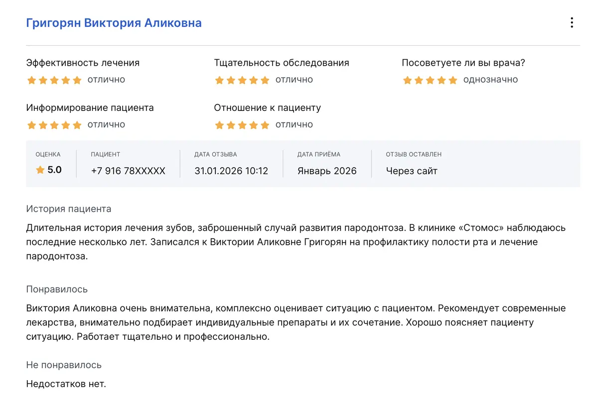 Длительная история лечения зубов, заброшенный случай развития пародонтоза. В клинике «Стомос» наблюдаюсь последние несколько лет. Записался к Виктории Аликовне Григорян на профилактику полости рта и лечение пародонтоза. Виктория Аликовна очень внимательна, комплексно оценивает ситуацию с пациентом. Рекомендует современные лекарства, внимательно подбирает индивидуальные препараты и их сочетание. Хорошо поясняет пациенту ситуацию. Работает тщательно и профессионально.