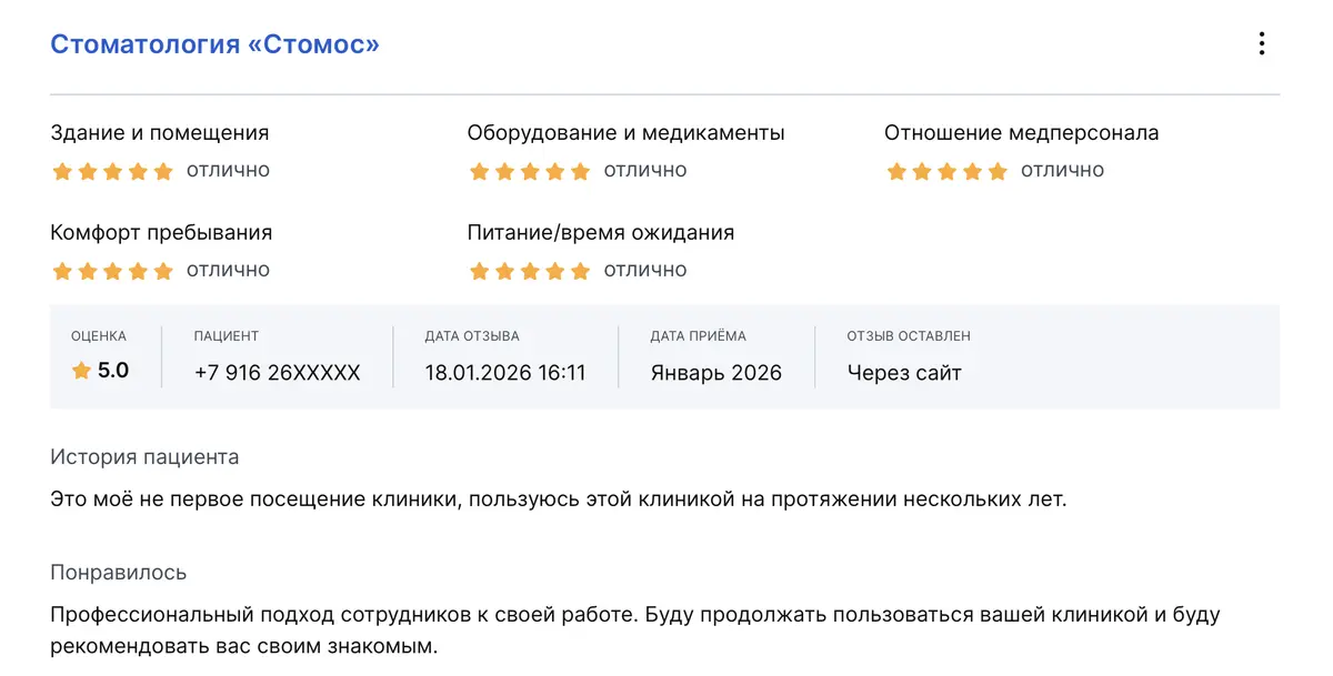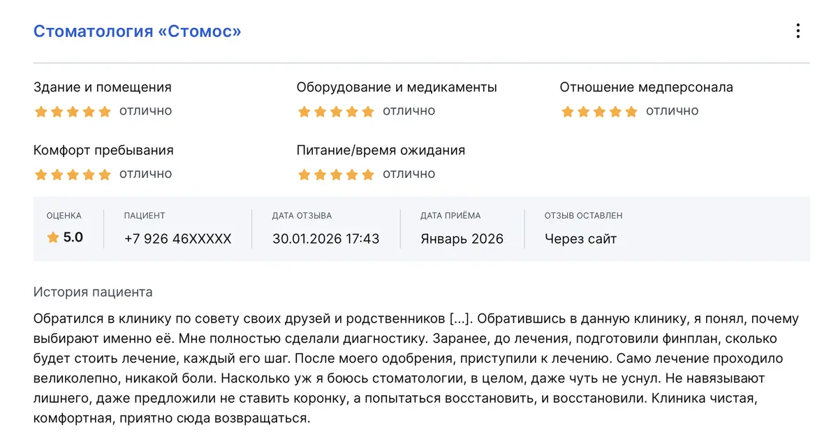 Клиника Стомос отличная. Консультации подробные, без спешки, впаривания дорогих услуг — все только по необходимости. Довольна сервисом, цены устраивают.
