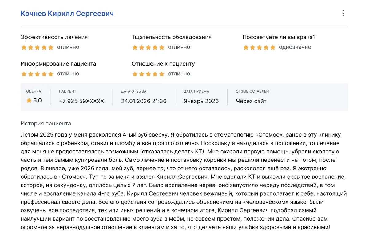 Летом 2025 года у меня раскололся 4-ый зуб сверху. Я обратилась в стоматологию «Стомос», ранее в эту клинику обращались с ребёнком, ставили пломбу и все прошло отлично. Поскольку я находилась в положении, то лечение для меня не предоставлялось возможным (отказалась делать КТ). Мне оказали первую помощь, убрали сколотую часть и тем самым купировали боль. Само лечение и постановку коронки мы решили перенести на потом, после родов. В январе, уже 2026 года, мой зуб, вернее то, что от него оставалось, раскололся ещё раз. Я экстренно обратилась в «Стомос». Тут-то за меня и взялся Кирилл Сергеевич. Мне сделали КТ и выявили скрытое воспаление, которое, на секундочку, длилось целых 7 лет. Было воспаление нерва, оно запустило череду последствий, в том числе и воспаление канала 4-го зуба. Кирилл Сергеевич человек вежливый, который располагает к себе, настоящий профессионал своего дела. Все его действия сопровождались объяснением на «человеческом» языке, были озвучены все последствия, тех или иных решений и в конечном итоге, Кирилл Сергеевич подобрал самый наилучший вариант по восстановлению моего зуба в моём, не совсем простом, положении дела. Спасибо вам огромное за неравнодушное отношение к клиентам и за то, что делаете наши улыбки здоровыми и красивыми!