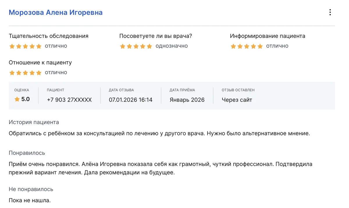 Обратились с ребёнком за консультацией по лечению у другого врача. Нужно было альтернативное мнение. Понравилось: Приём очень понравился. Алёна Игоревна показала себя как грамотный, чуткий профессионал. Подтвердила прежний вариант лечения. Дала рекомендации на будущее.