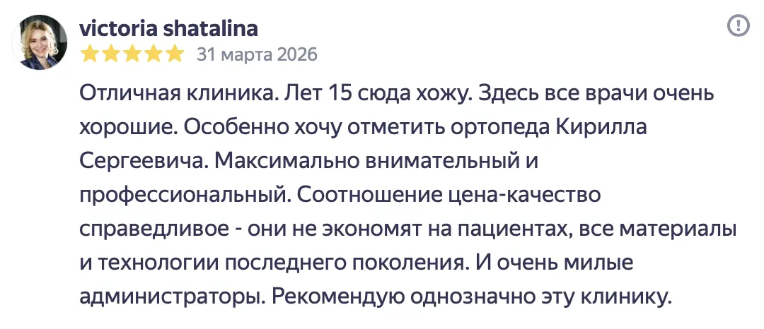 Отличная клиника. Лет 15 сюда хожу. Здесь все врачи очень хорошие. Особенно хочу отметить ортопеда Кирилла Сергеевича. Максимально внимательный и профессиональный. Соотношение цена-качество справедливое - они не экономят на пациентах, все материалы и технологии последнего поколения. И очень милые администраторы. Рекомендую однозначно эту клинику.