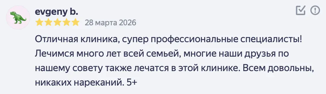 Отличная клиника, супер профессиональные специалисты! Лечимся много лет всей семьей, многие наши друзья по нашему совету также лечатся в этой клинике. Всем довольны, никаких нареканий. 5+